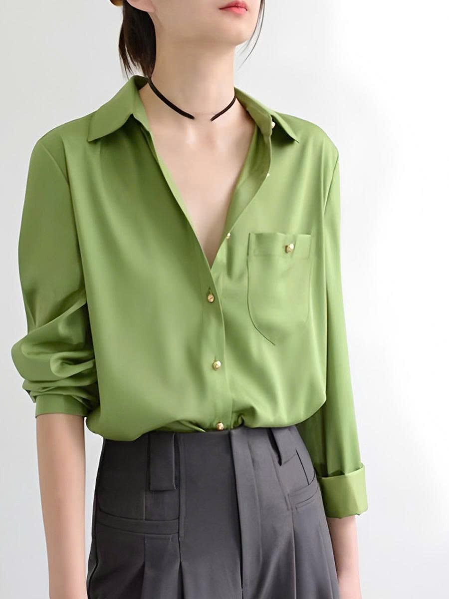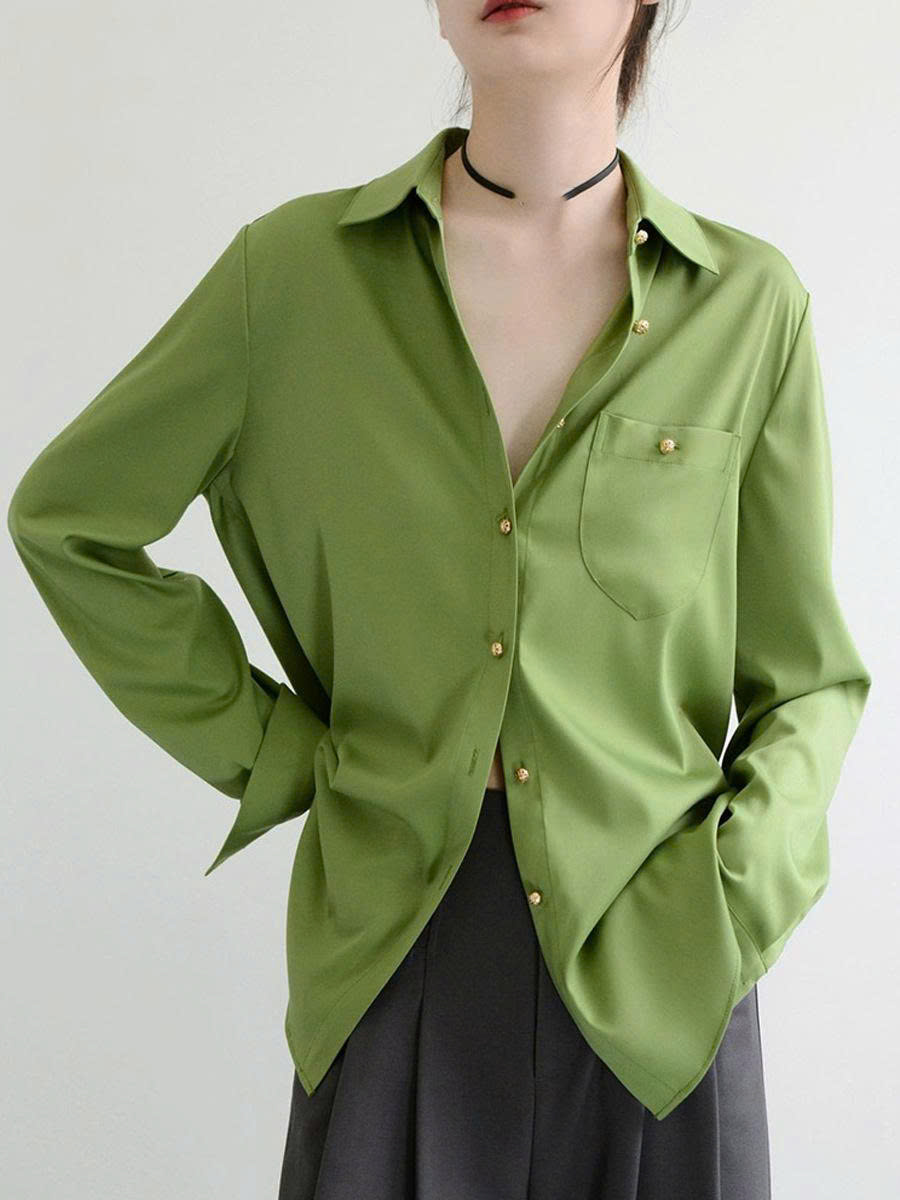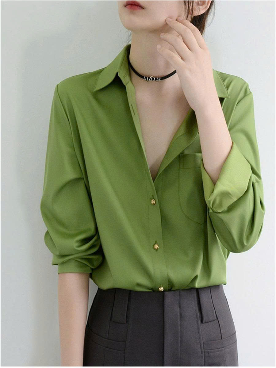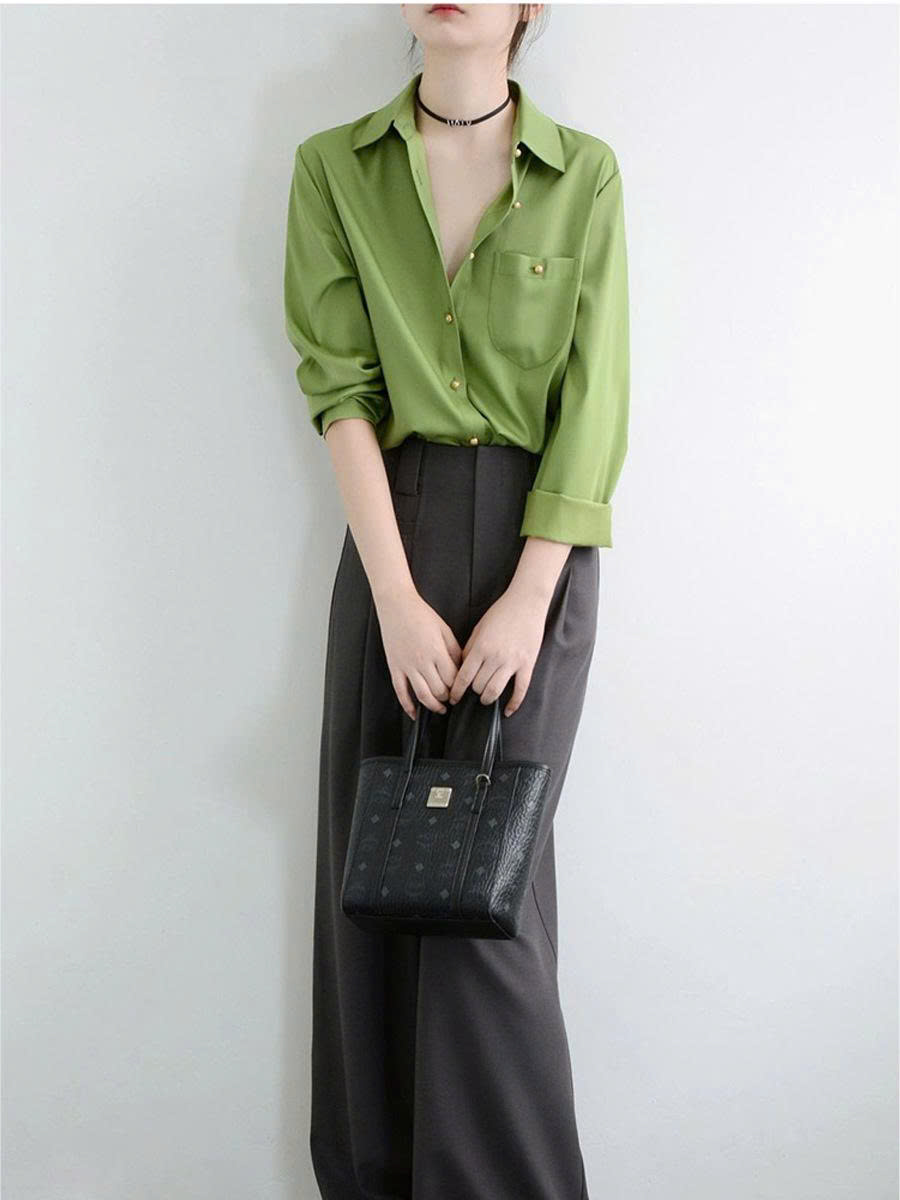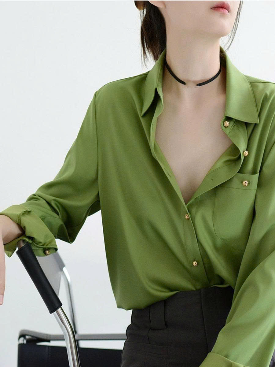 Áo sơ mi dài tay màu xanh lá cây thanh lịch, form hơi rộng vừa vặn giúp tôn dáng mà vẫn thoải mái. Thiết kế tinh tế, hiện đại, dễ phối đồ.