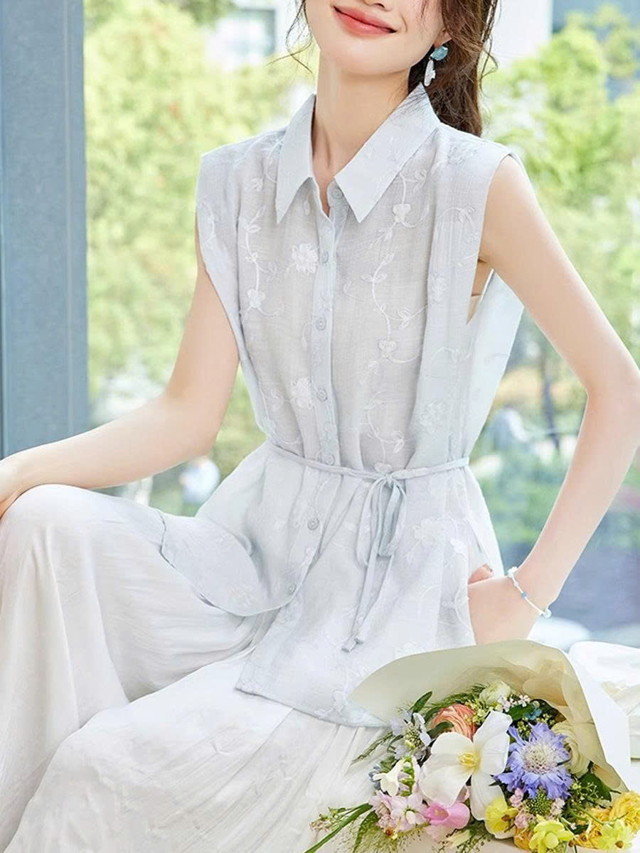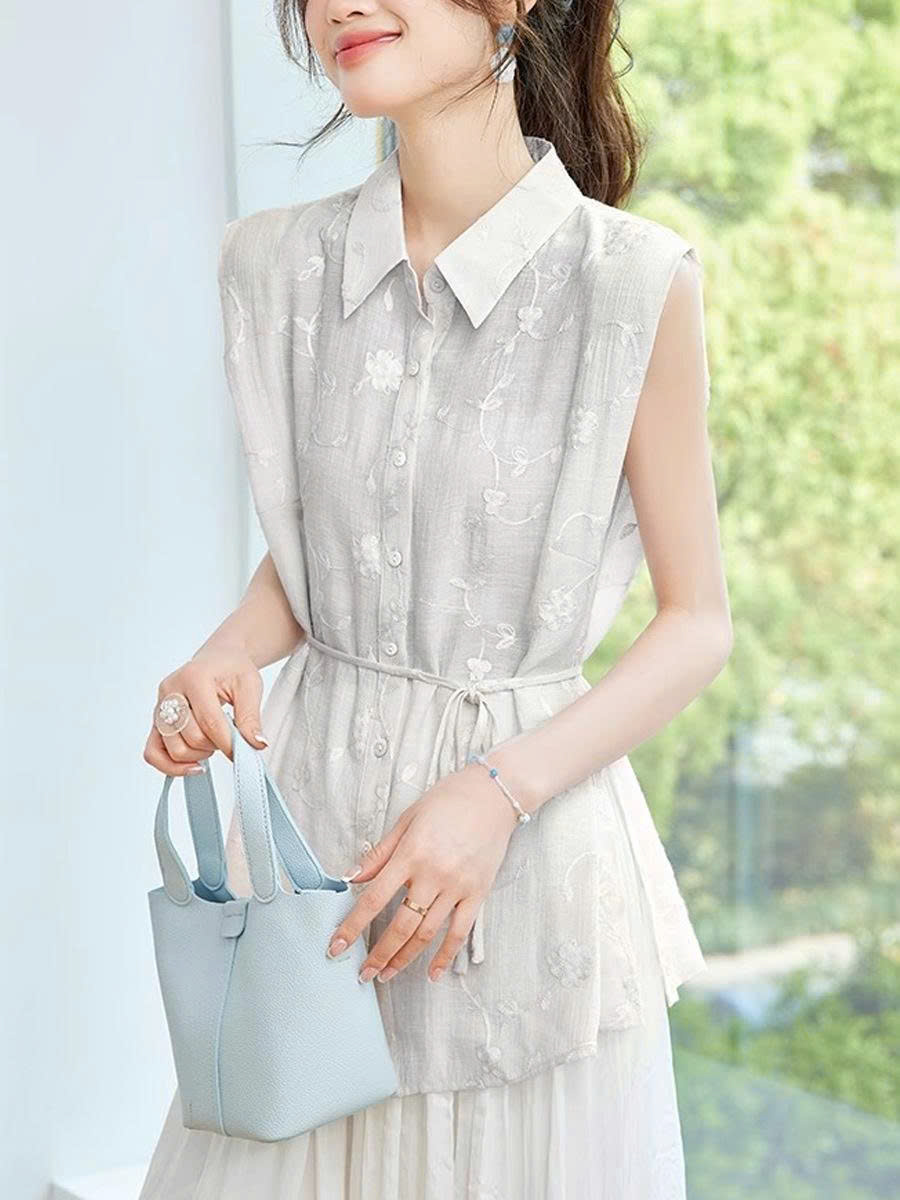 Áo sơ mi nữ không tay, thắt eo với chất liệu voan mỏng cao cấp mang đến sự thoáng mát, nhẹ nhàng. Thiết kế thêu họa tiết hoa lá tinh tế tạo điểm nhấn thanh lịch và hiện đại, phù hợp cho nàng khi đi làm, đi chơi hay dự tiệc.