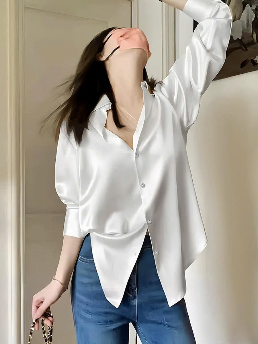 Chiếc áo sơ mi satin trắng cao cấp với thiết kế dáng rộng ôm nhẹ, mang phong cách Pháp tinh tế và thanh lịch. Chất liệu satin mềm mịn, bóng nhẹ, thoáng mát, phù hợp cho mùa thu.