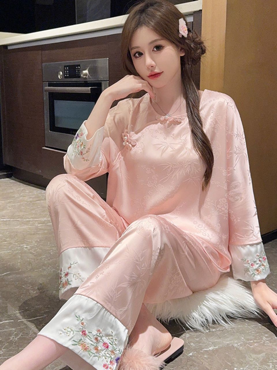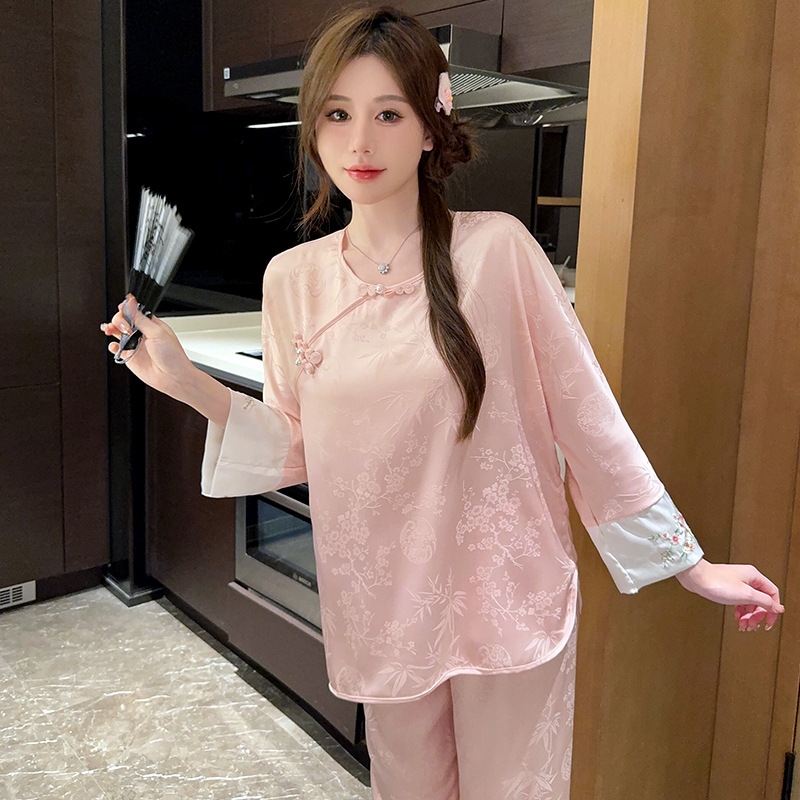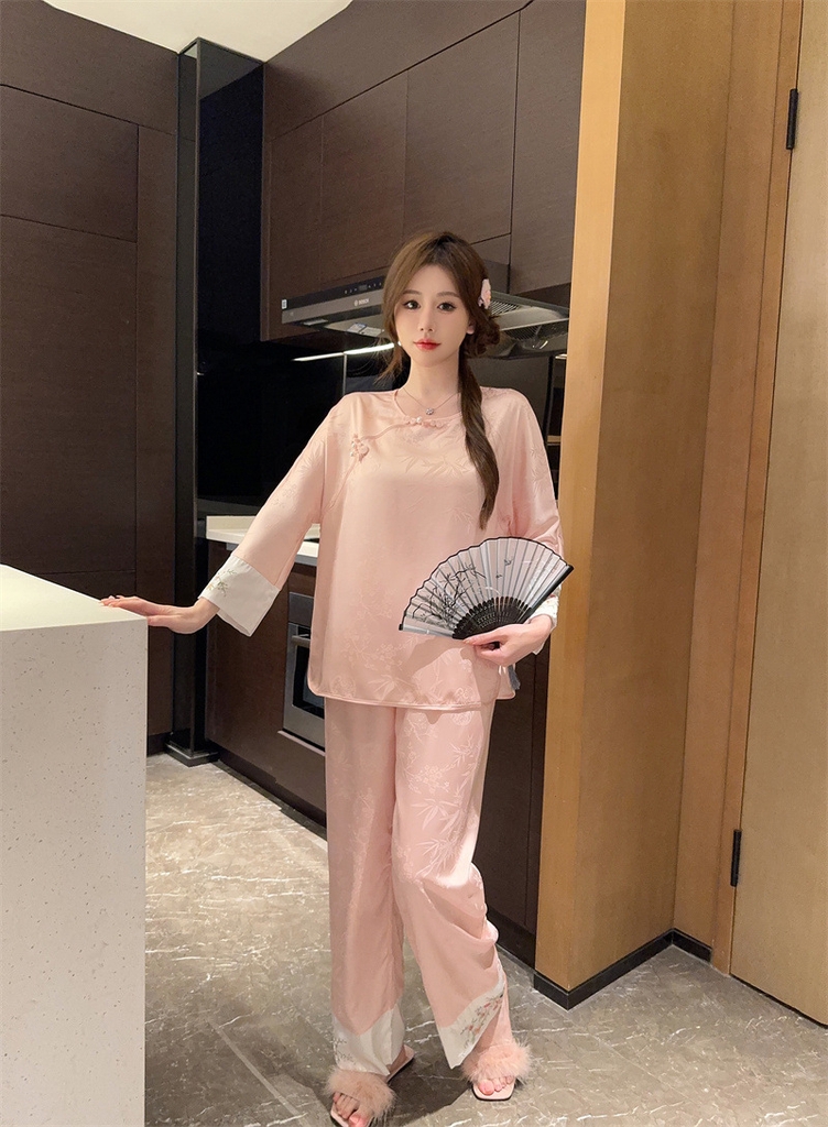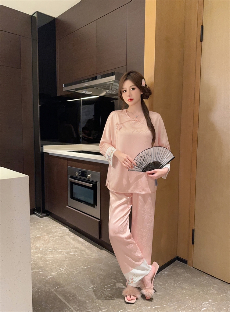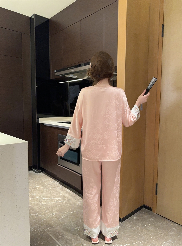 1. Chi tiết sản phẩm: Bộ đồ ngủ kiểu Trung Quốc thêu cúc lụa mỏng jacquard sang trọng và thoải mái XINY DN102250