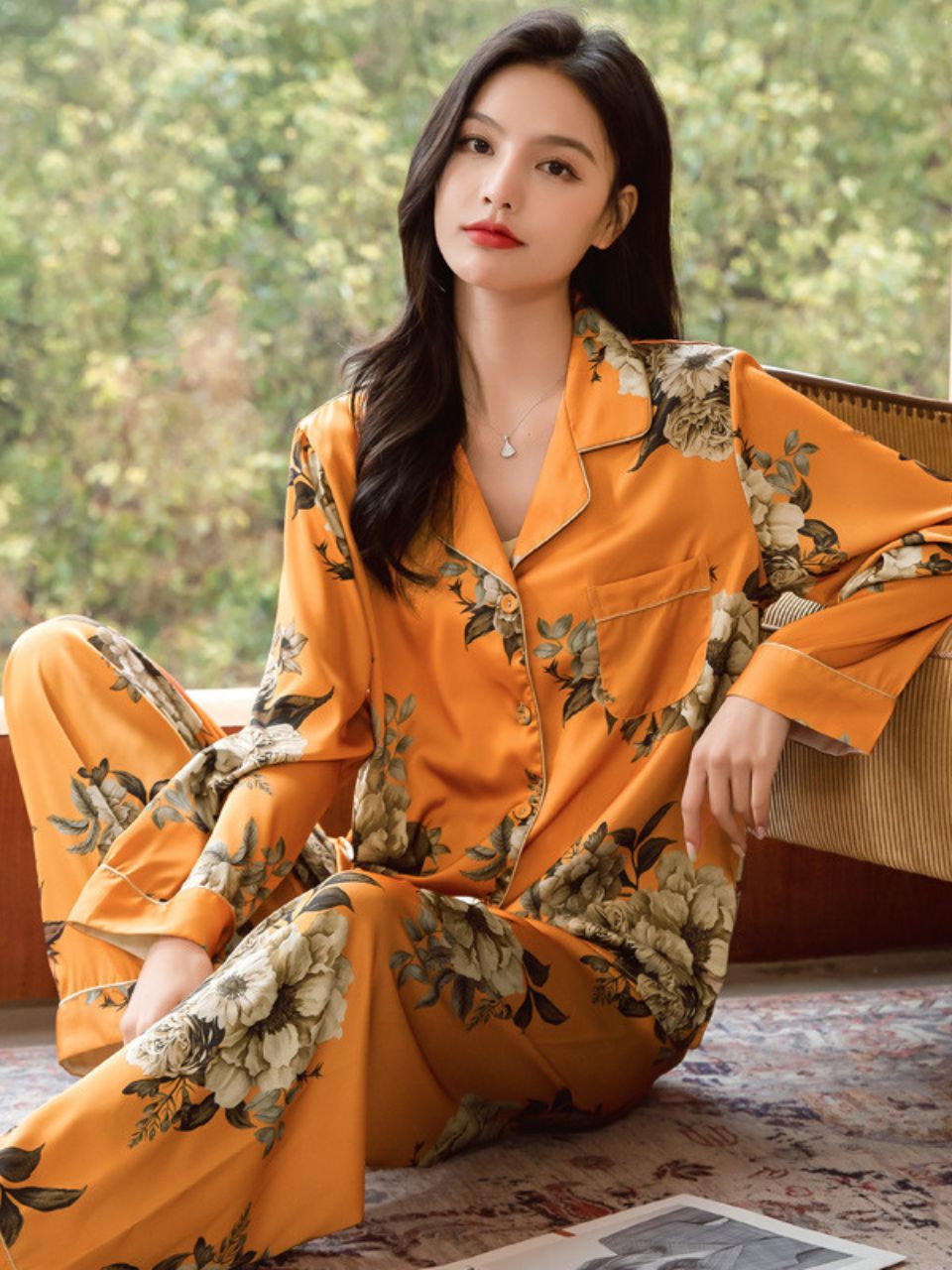 1. Chi tiết sản phẩm: Đồ ngủ Pijama lụa băng cao cấp màu cam họa tiết hoa DN429240