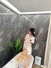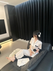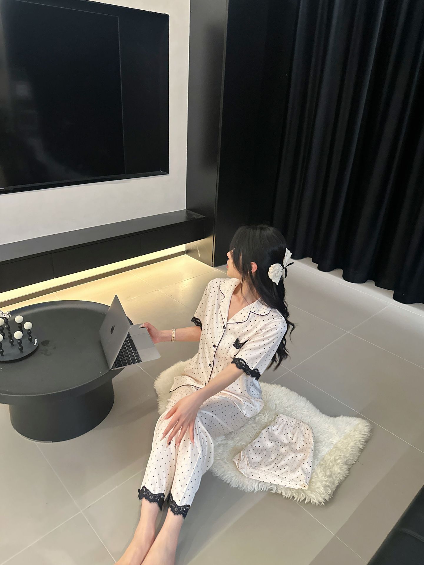 1. Chi tiết sản phẩm: Đồ ngủ Pijama lụa xước hàng hiệu cộc tay viền ren chấm bi DN412240