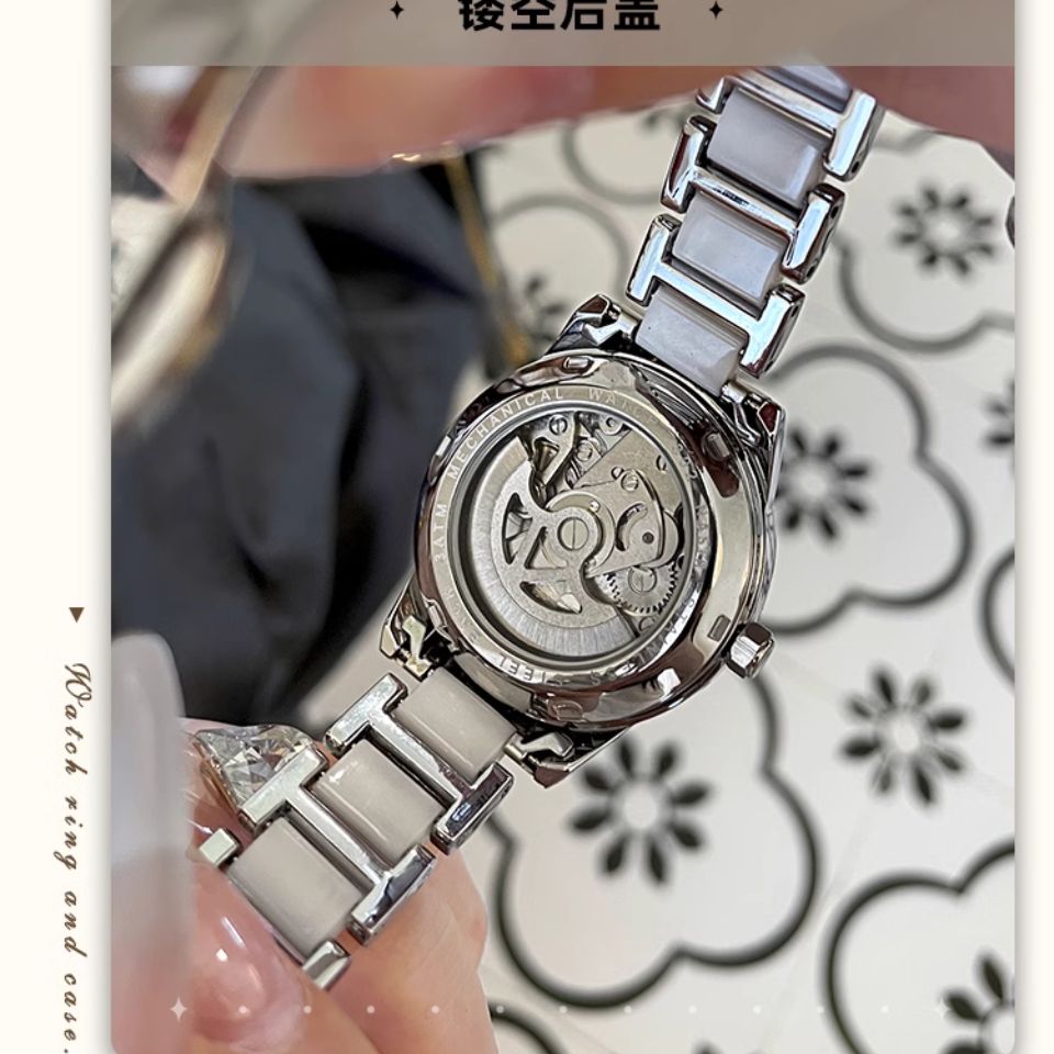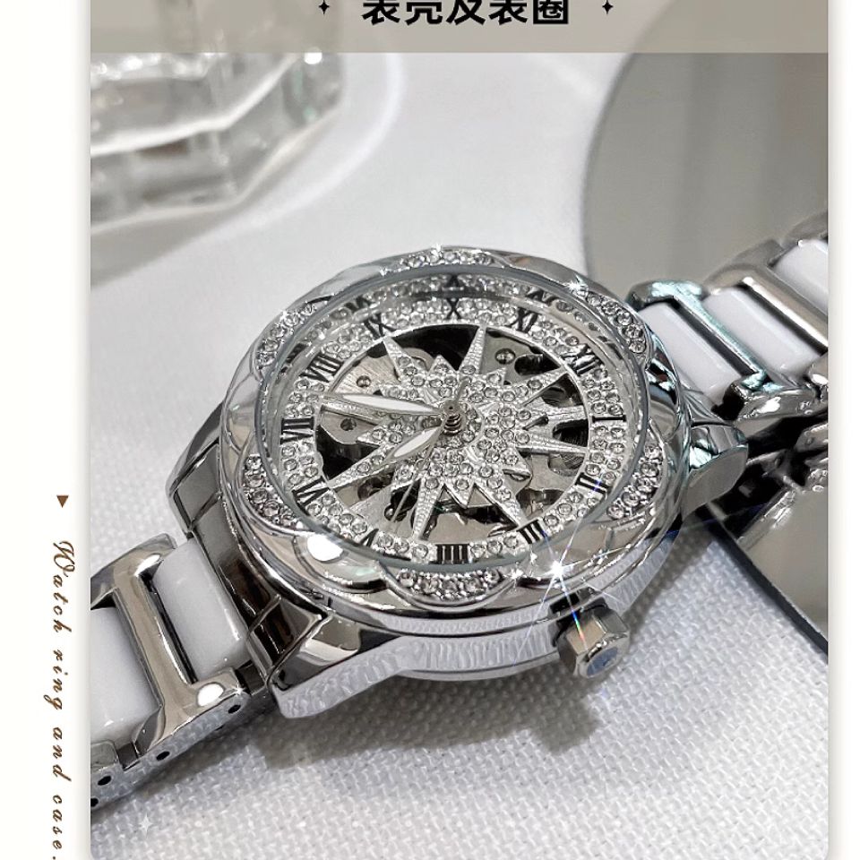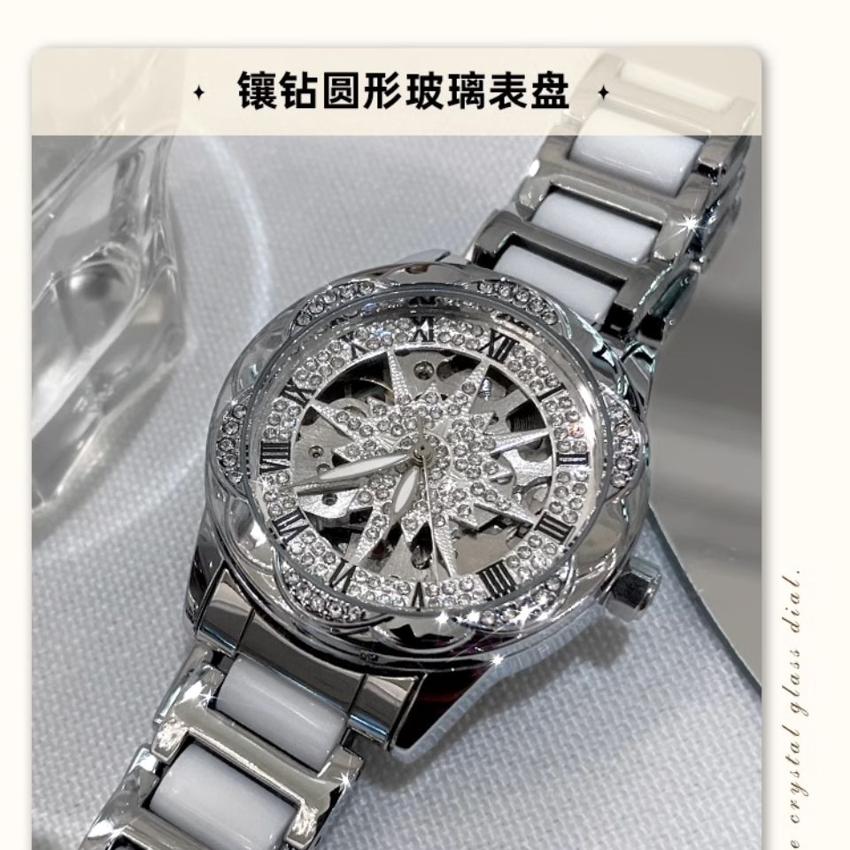 Thiết kế tinh tế và sang trọng: Mặt đồng hồ tròn, với các chi tiết kim cương tinh xảo, kết hợp với dây đeo làm từ đồ gốm cao cấp, mang lại vẻ đẹp thanh thoát và đẳng cấp.