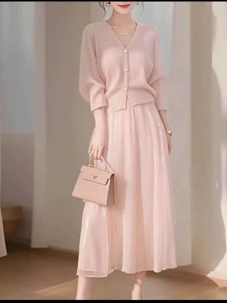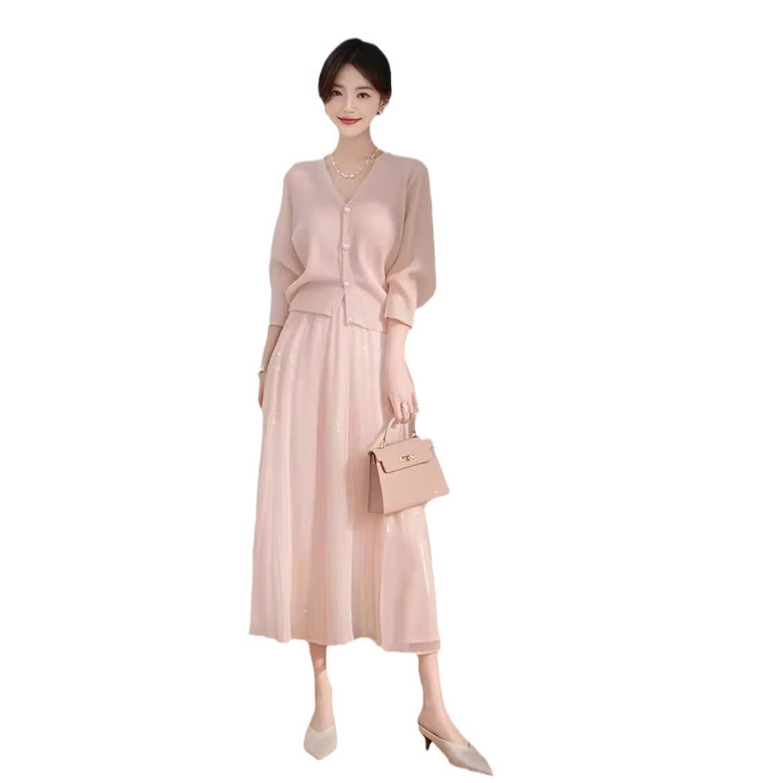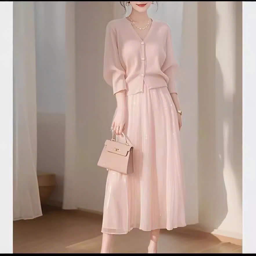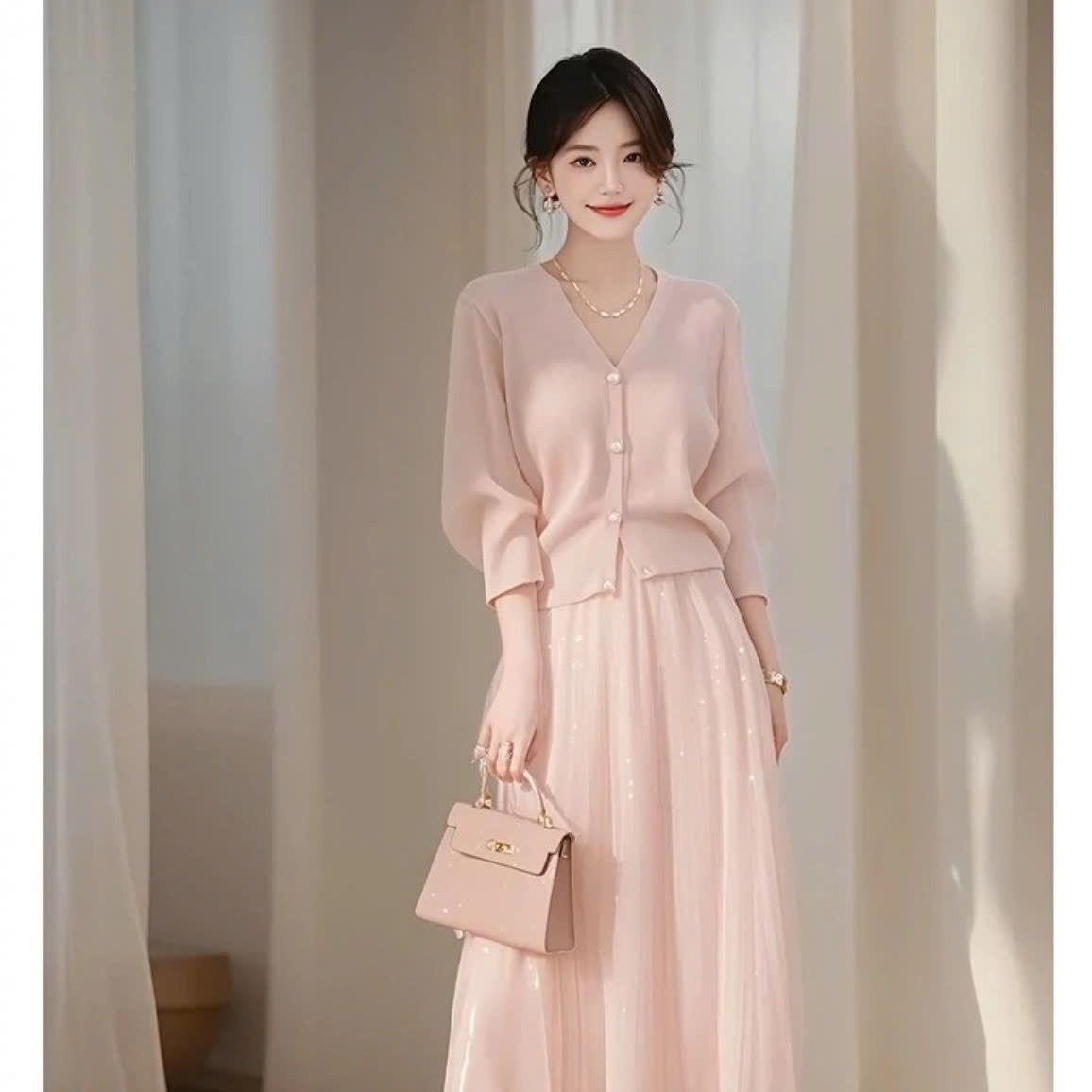 1. Chi tiết sản phẩm: Set đầm áo len dêt kim hồng và chân váy voan phong cách Hàn Quốc D495240