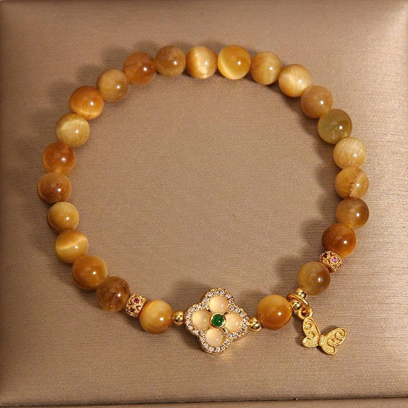 Vòng tay nữ đá Mắt Hổ Vàng cao cấp kết hợp charm cỏ bốn lá may mắn mang đến vẻ đẹp sang trọng – tinh tế – cổ điển. Thiết kế lấy cảm hứng từ phong cách Trung Hoa vừa độc đáo, vừa mang ý nghĩa phong thủy, phù hợp để đeo hàng ngày hoặc làm quà tặng.