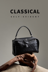 Túi xách Boston nữ cao cấp mùa xuân hè 2025 mang phong cách tối giản nhưng sang trọng với chất liệu da bò thật lớp đầu tiên, bề mặt nhăn tự nhiên và chi tiết trầy xước thủ công tạo vẻ ngoài cá tính, đậm chất thời trang cao cấp.