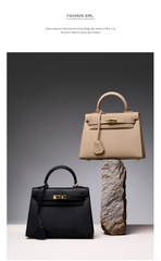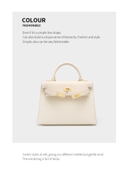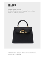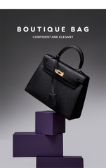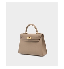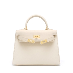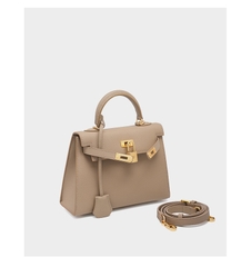 Thiết kế: Form hộp Kelly cổ điển với nắp gập, khóa xoay kim loại sáng bóng.