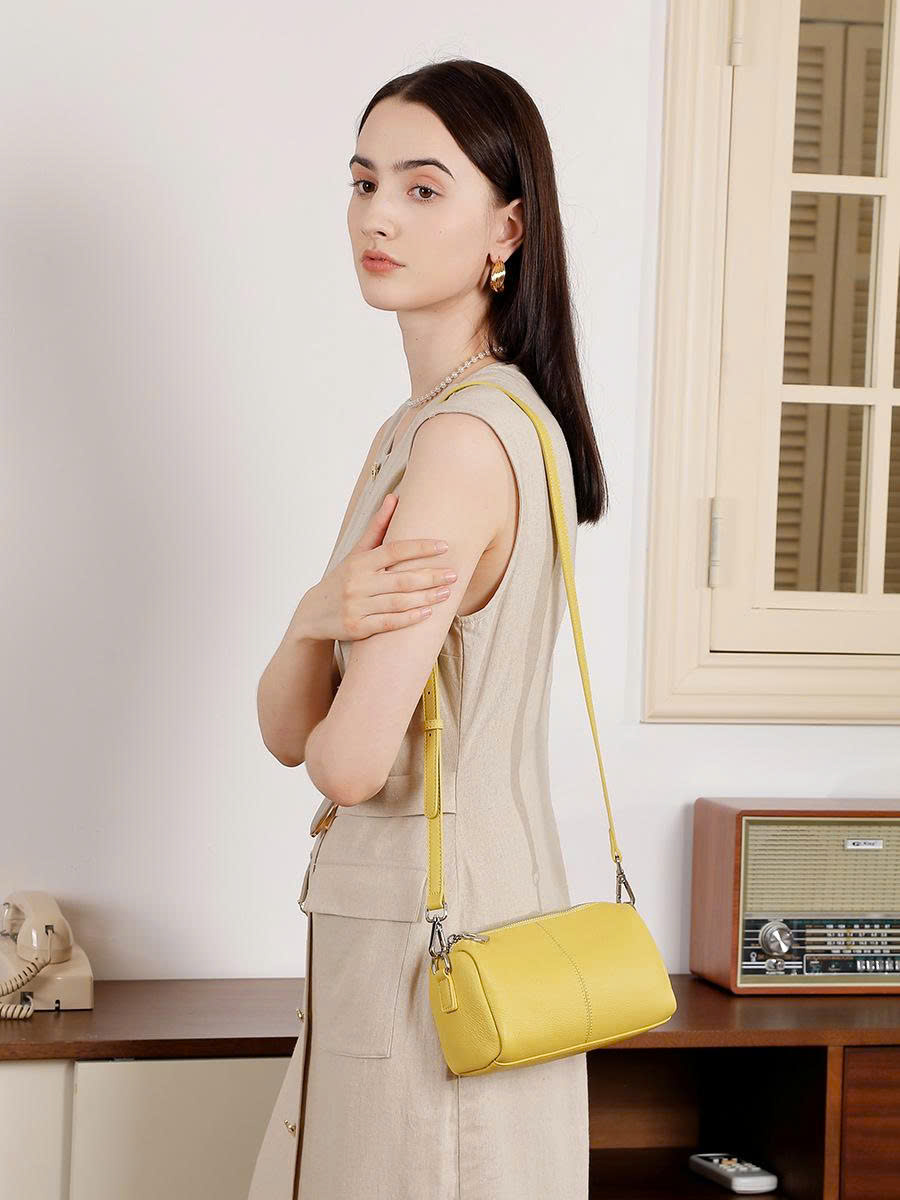 Túi xách nhỏ hình trụ độc đáo, làm từ da bò thật lớp trên cùng mềm mại, bền đẹp và sang trọng. Thiết kế gối mini hiện đại, vừa tiện lợi vừa thời trang, dễ dàng mang đi làm, đi chơi hay dự tiệc.