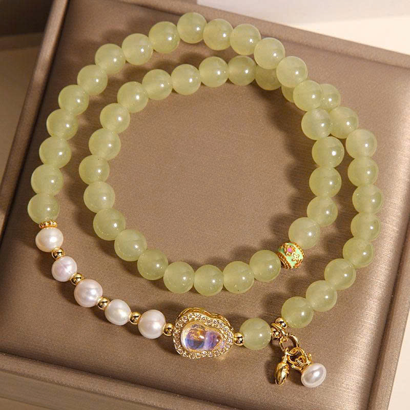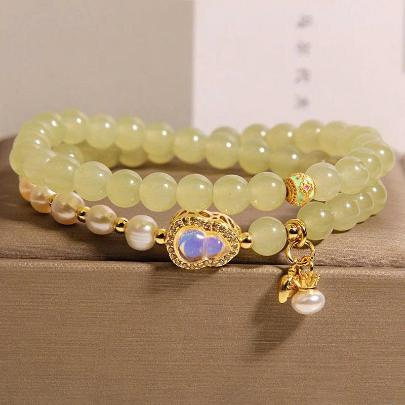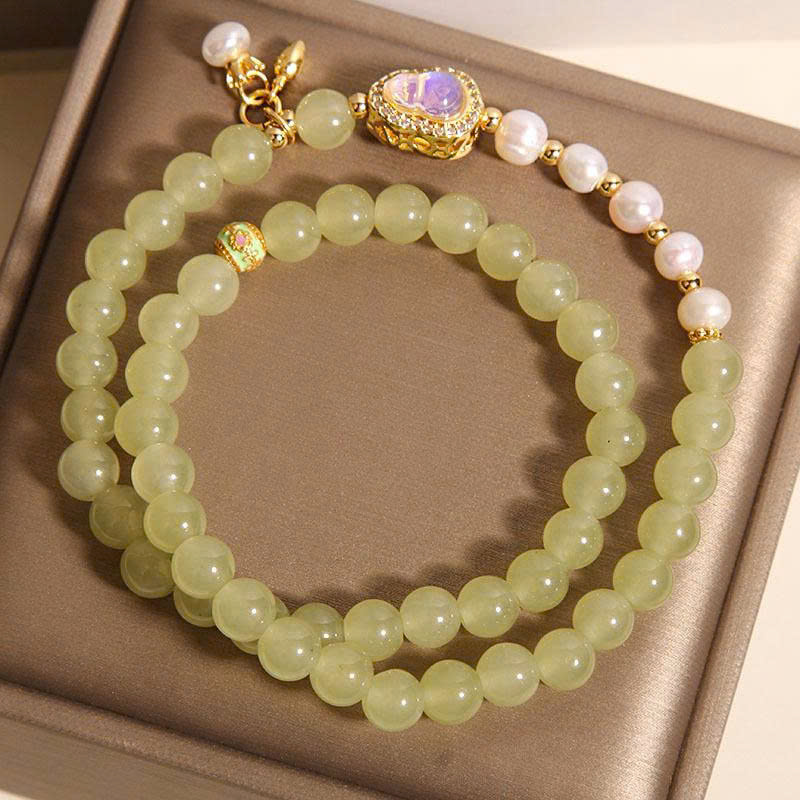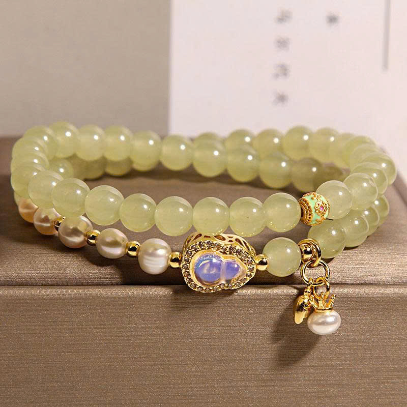Thiết kế xếp chồng 2 vòng: Phối hợp tinh tế giữa vòng tay ngọc bích và pha lê hình quả bầu, tạo nên phong cách thời trang sang trọng nhưng không quá phô trương.