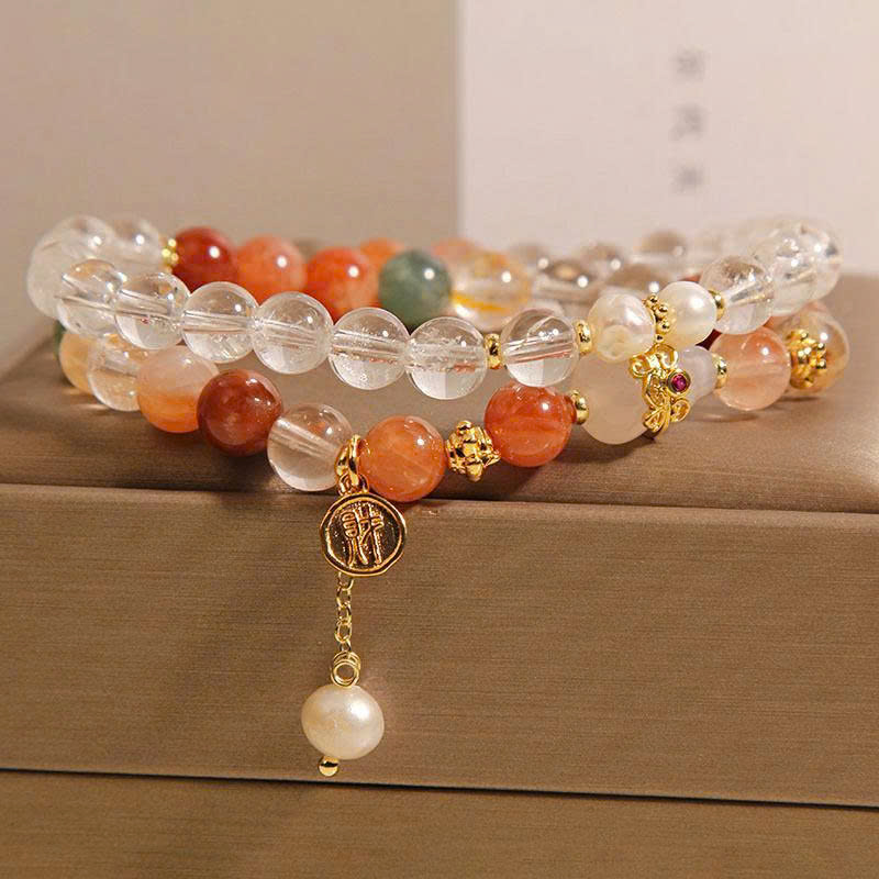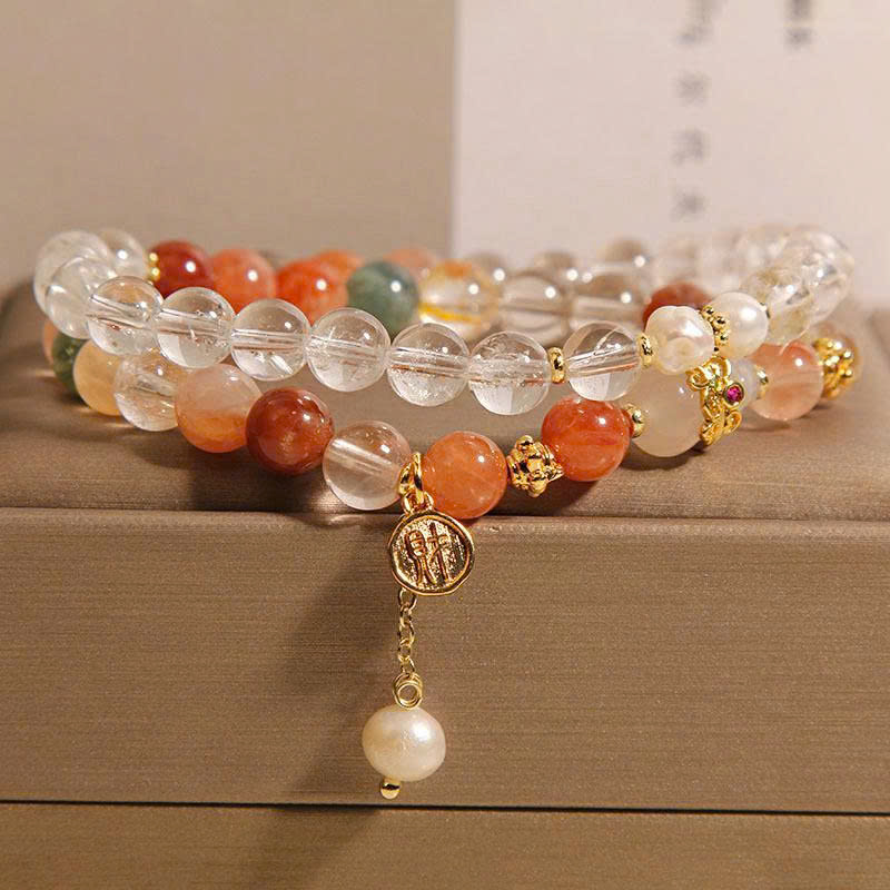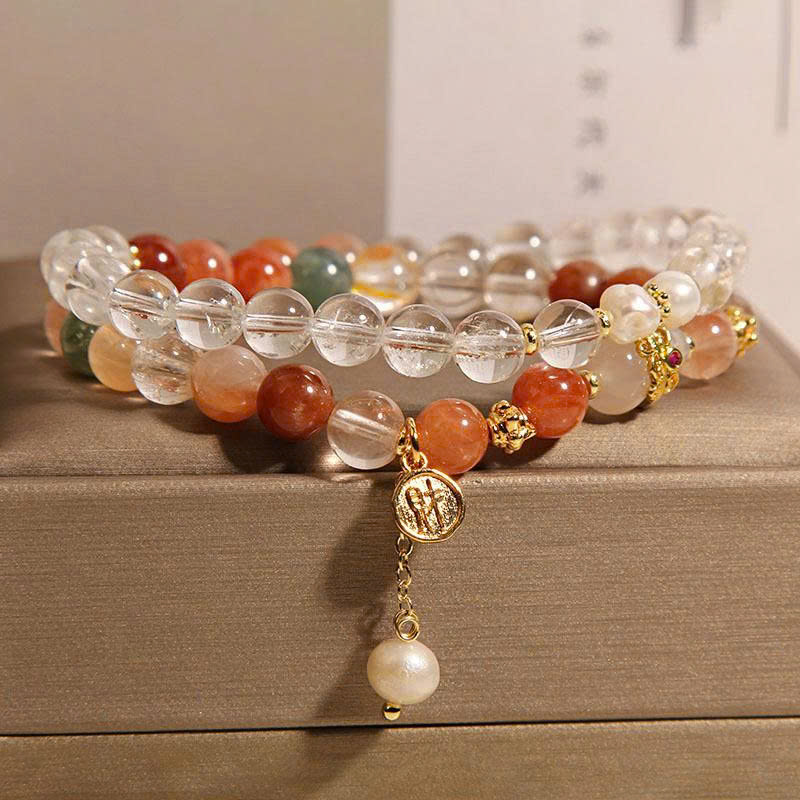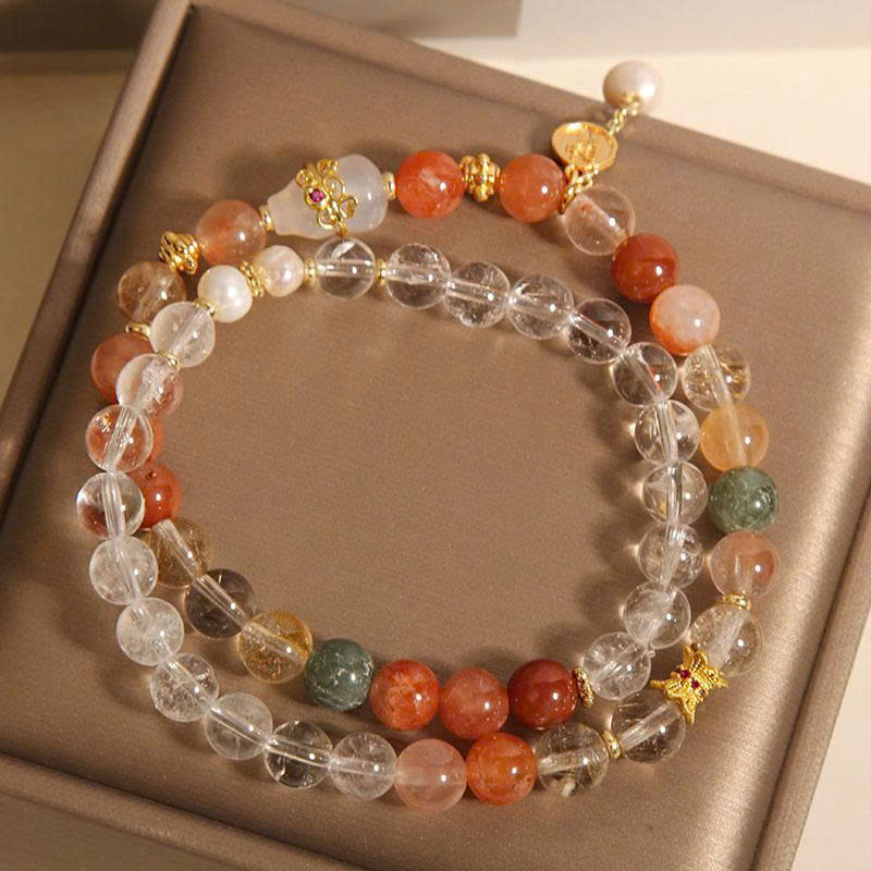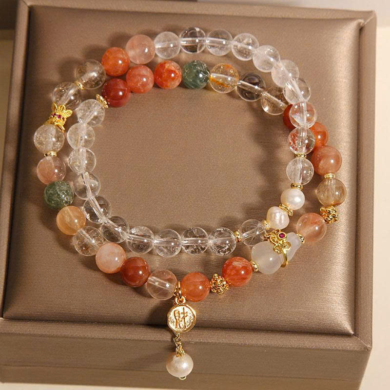 Thiết kế xếp chồng hai lớp pha lê trắng tinh tế, kết hợp cùng đá vàng rutilated sang trọng – mang lại vẻ đẹp vừa cổ điển vừa hiện đại.